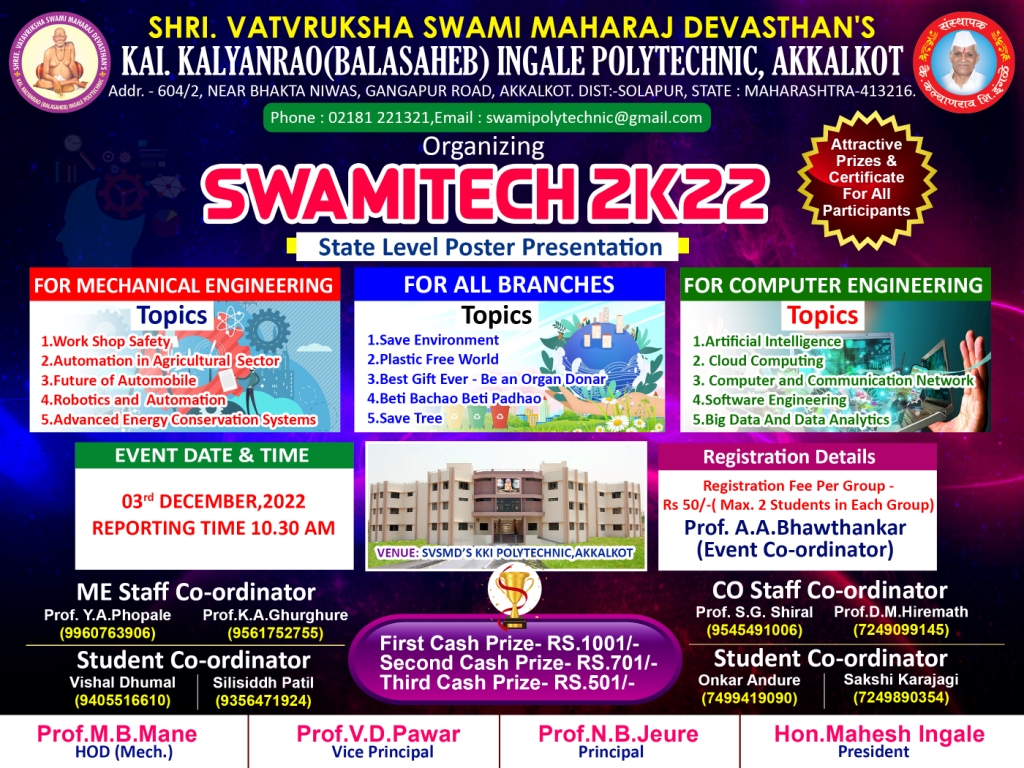 The three year diploma programme in mechanical engineering is for the students who have passed 10th standard. The department feeds an excellent educational environments complemented by fine teaching for its students to fulfill industrial and society needs. The aim of diploma course in mechanical engineering at SVSMD’s Kai. Kalyanrao (Balasaheb) Ingale, Polytechnic Akkalkot is to cast aside the students for professional practice in an era of rapidly advancing interdisciplinary technology.